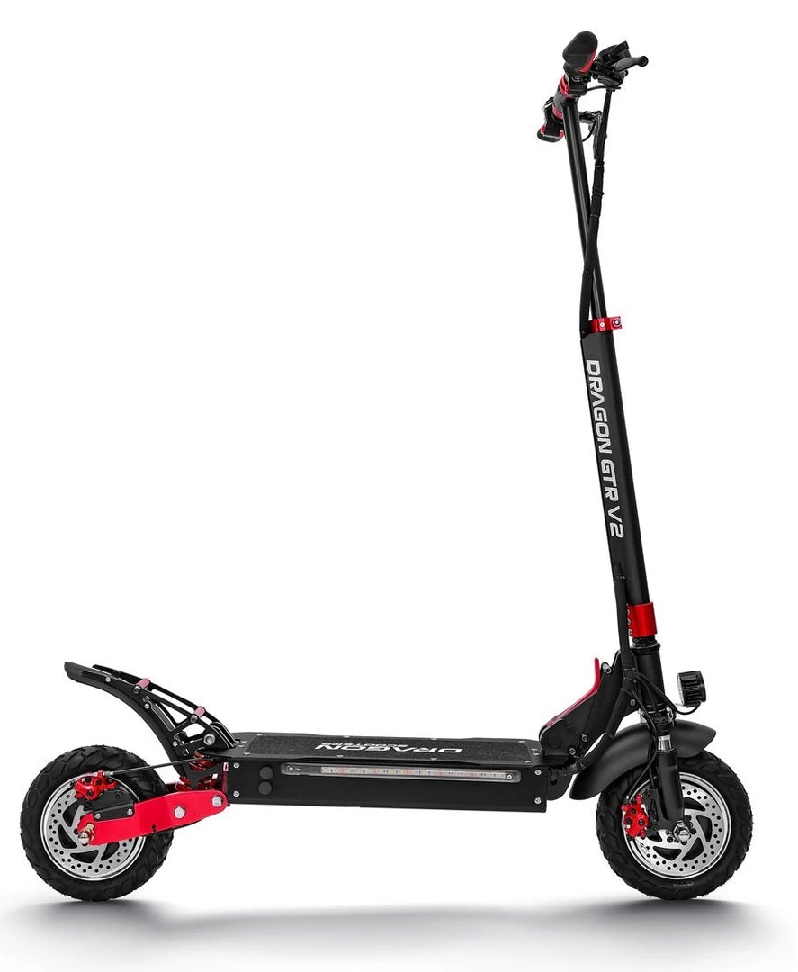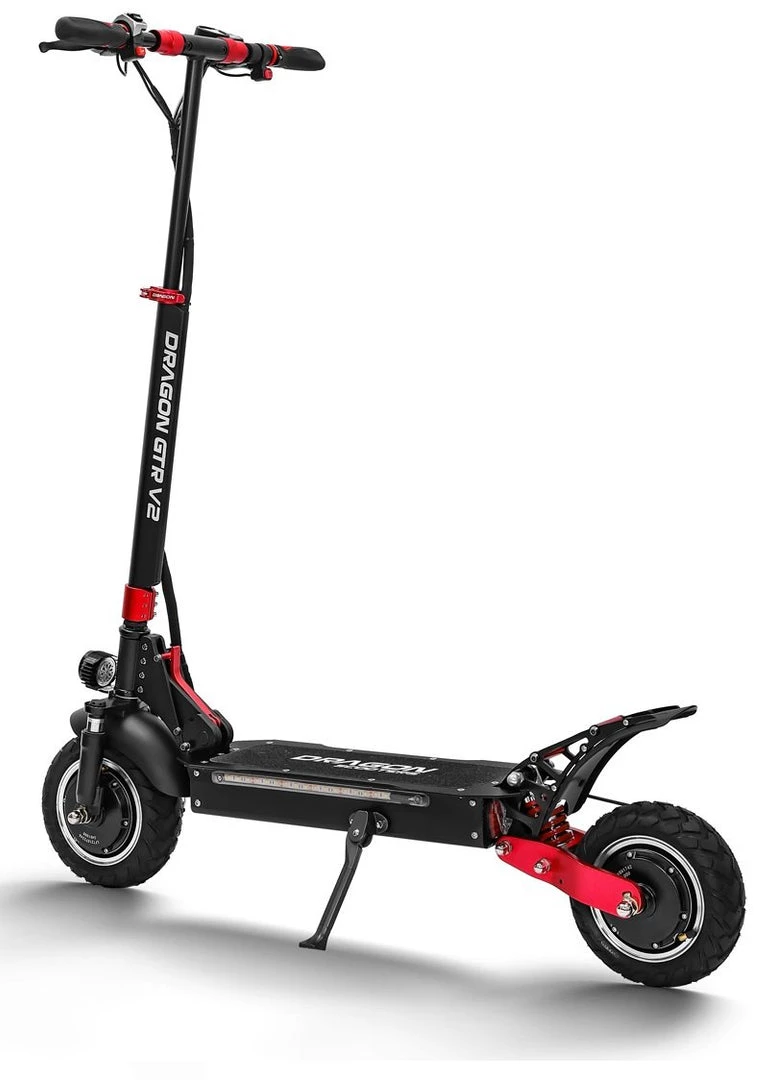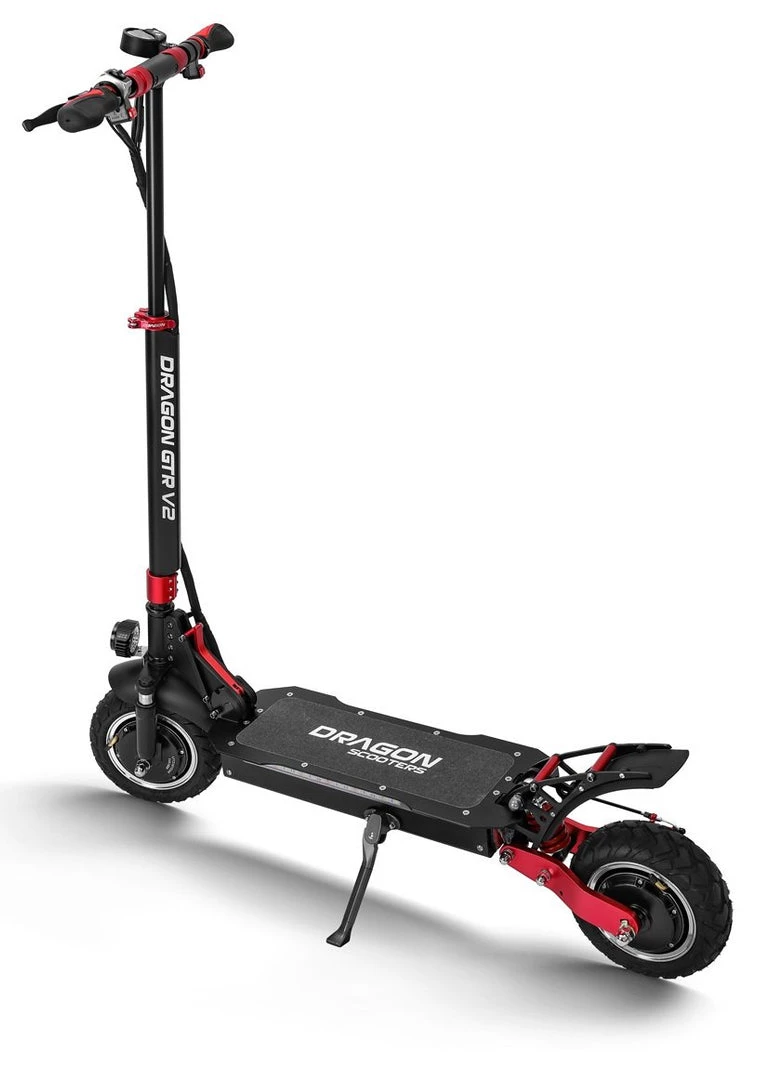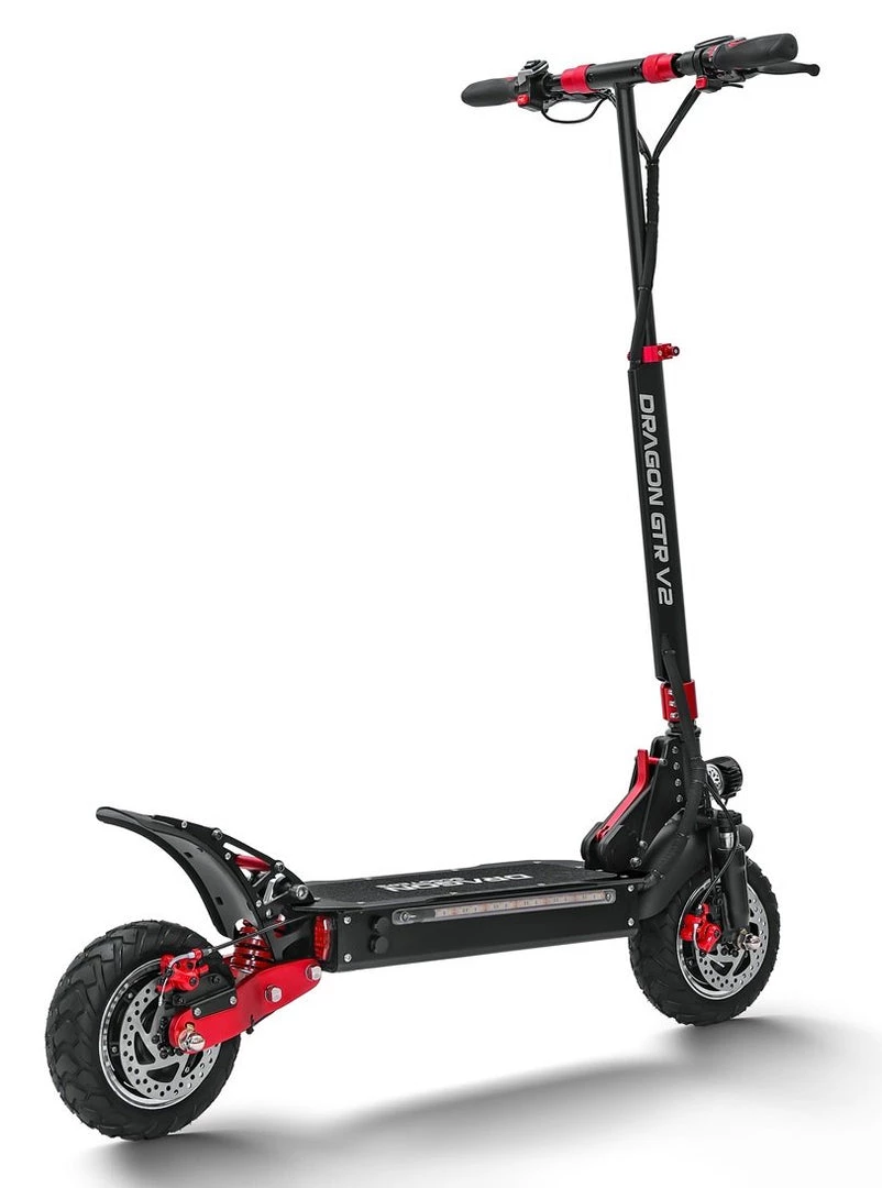 It is a portable, foldable, powerful OFF-ROAD Racing electric scooter. If you are searching for more power and torque that can handle the steeper inclines, and the ability to go off-road than this electric scooter is for you! Boasting a peak power of 2400w, this electric scooter is suitable for just about any terrain from roads to gravel and grass. The GTR V2 electric scooter has been built tough using aviation-grade alloy and quality components. Equipped with dual front and dual rear shocks, aids in a smoother ride when the terrain is rough. The massive 10-inch OFF-ROAD wheels, front and rear disc brakes and a large anti-slip platform make riding safe fun and comfortable. Dual motors delivery a massive 2400w of peak power. You are able to select to use single or dual motors with a push of the button. All our Dragon Electric Scoters comes with a 2-year warranty on the structure and frame.