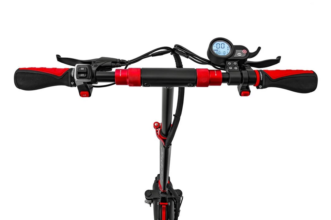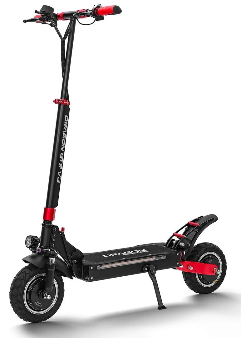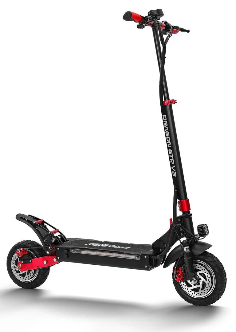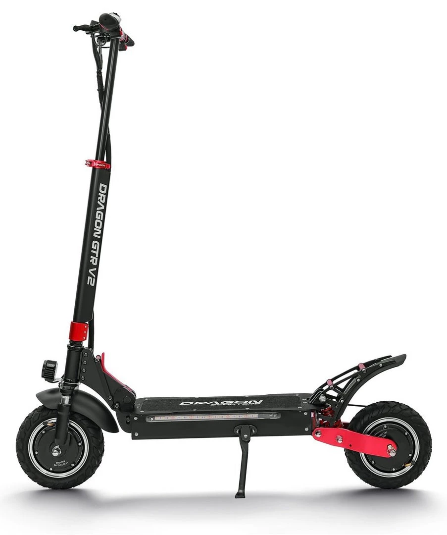 It is a portable, foldable, powerful OFF-ROAD Racing electric scooter. If you are searching for more power and torque that can handle the steeper inclines, and the ability to go off-road than this electric scooter is for you! Boasting a peak power of 2400w, this electric scooter is suitable for just about any terrain from roads to gravel and grass. The GTR V2 electric scooter has been built tough using aviation-grade alloy and quality components. Equipped with dual front and dual rear shocks, aids in a smoother ride when the terrain is rough. The massive 10-inch OFF-ROAD wheels, front and rear disc brakes and a large anti-slip platform make riding safe fun and comfortable. Dual motors delivery a massive 2400w of peak power. You are able to select to use single or dual motors with a push of the button. All our Dragon Electric Scoters comes with a 2-year warranty on the structure and frame.